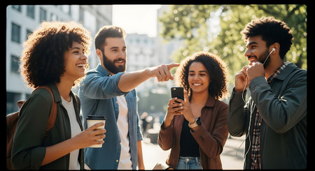 A diverse group of four friends laughing and looking at a smartphone on a sunny day in an urban setting.
