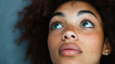 Young woman with curly hair gazing thoughtfully upward against a gray background in a contemplative moment