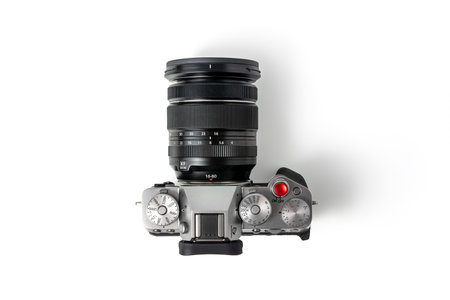 Belgrade, Serbia - November 01, 2024. Fujifilm X-T5 mirrorless camera with Fujinon XF 16-80mm f/4 R OIS WR lens is displayed for editorial purposes. Isolated on white background wi