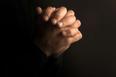 Praying crossed hands on a black background. Light from above. Hands folded in prayer. Hand gestures