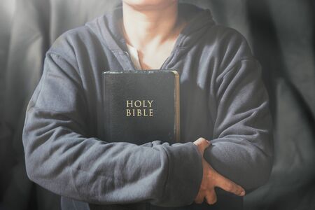 Close up of hand holding holy bible book. Concept of faith, spirituality and religion.