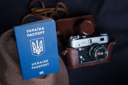 Ukrainian travel passport on gray background. sunglasses, hat. vintage camera on the background.