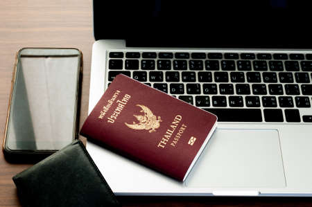 Open laptop with digital smartphone wallet and passport isolated on old wooden desk.