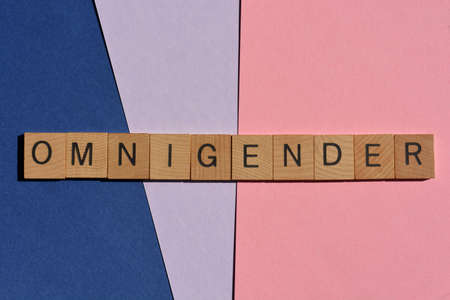 Omnigender, word in wooden alphabet letters isolated on blue, pink and mauve background
