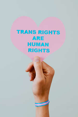 closeup of a young person, wearing a wristband patterned with the transgender pride flag, holding a pink heart with the text transgender rights are human rights cutout in it, on a pale blue background