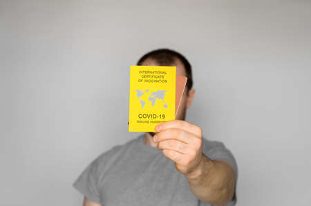 Adult man wearing t-shirt holding yellow International Certificate of Vaccination on gray background. Traveling Immune passport, as proof vaccinated against Covid-19. Close-up
