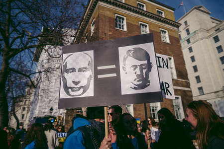 Downing Street, London | UK - 2022.02.26: Ukrainian people protest, thousands gather to demand tougher sanctions on Russia from British Government, EU and USA to stop the war in Ukraine