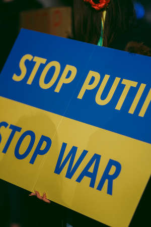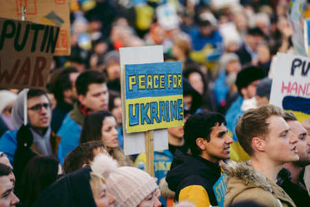 Cropped shot of protestors with Ukrainian blue and yellow ribbons and flags protesting against war in Ukraine in street