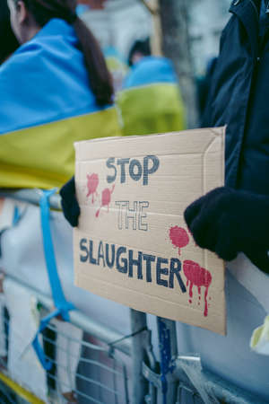 Russian embassy, London | UK - 2022.04.07: Ukrainian people protest, thousands gather to demand tougher sanctions on Russia from British Government, EU and USA to stop the war in Ukraine