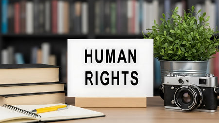 A wooden desk holds a human rights sign, books, a camera, and a potted plant in a library setting.