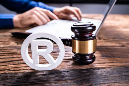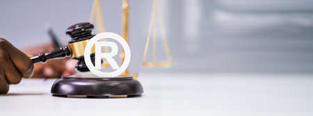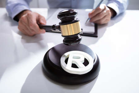 Close-up Of Judge Striking Mallet On Trademark Copyright Symbol