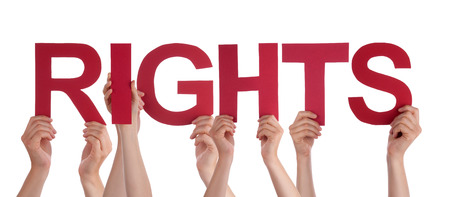 Many Caucasian People And Hands Holding Red Straight Letters Or Characters Building The Isolated English Word Rights On White Background