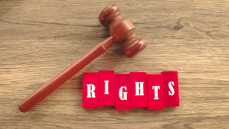 Wooden Gavel and Red Blocks Spelling RIGHTS on Wood Background Symbolizing Human Rights and Legal Justice