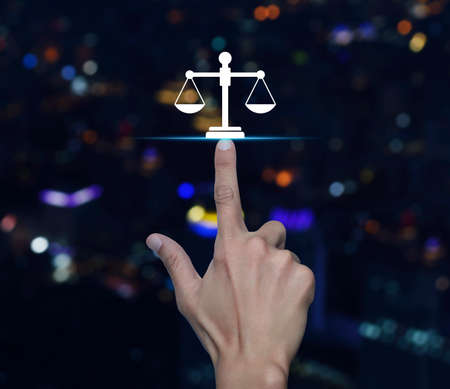 Hand pressing law flat icon over blur colorful night light modern city tower and skyscraper, Business legal service concept