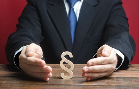 Man protects a paragraph figure. Protection of human rights freedoms, law respect, judicial system. Democratic institutions. Legislation, lawmaking. Legal assistance, lawyers services. Lobbying laws.
