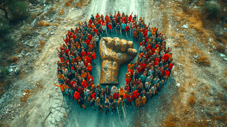 a group of people standing in the middle of a mountain in the shape of a stone hand symbolizing strength.