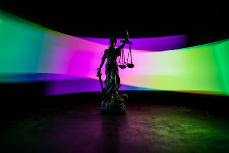 Law concept. Miniature colorful artwork decoration with fog and backlight. The Statue of Justice - lady justice or Iustitia / Justitia the Roman goddess of Justice. Selective focus