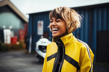 Young laughing woman with short bright hair wearing motorcycle gear and helmet, yellow and black colors, AI Generated