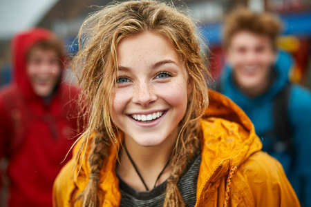 A joyful teen smiles brightly while friends cheer in the background during a group activity. The scene shows excitement and camaraderie in a natural setting.