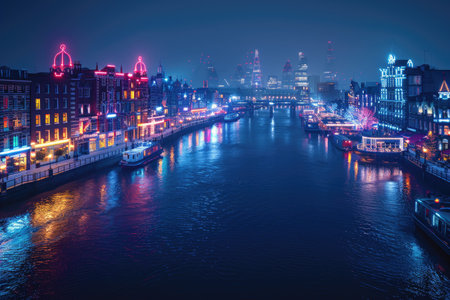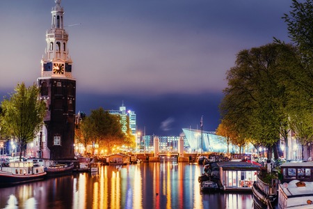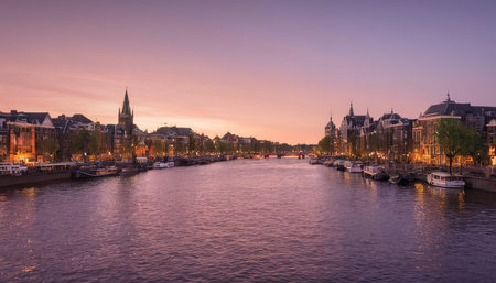 Water is reflecting warm city lights as it flows on a canal in amsterdam, netherlands at dusk