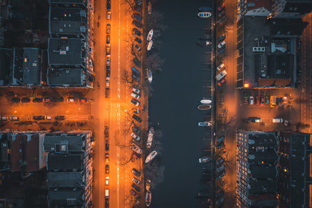 Amsterdam, Netherlands. Aerial top view of old city from above at night with canals and houses.