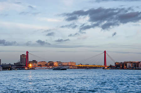 Rotterdam, The Netherlands, December 4, 2018: the setting sun shines on the red pylons and deck of Willems bridge across the river Nieuwe Maas