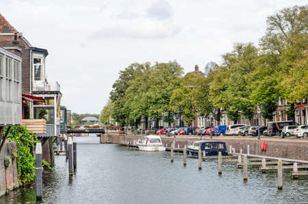 Gorinchem, the Netherlands, September 23, 2020: Linge river running through the old town with a tree-lined quay on one side and housed built by the water on the other side