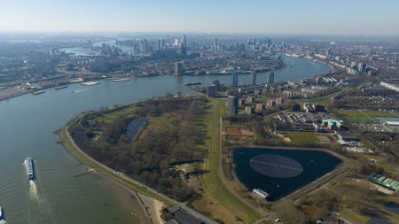 city view on Rotterdam skyline from a distance, SOuth Holland, The Netherlands, Nieuwe Maas river, solar panel on water. Aerial photo