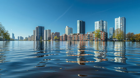 Discover a serene cityscape featuring modern buildings reflecting on calm water under a blue sky filled with fluffy clouds, capturing the tranquility of urban life.