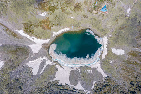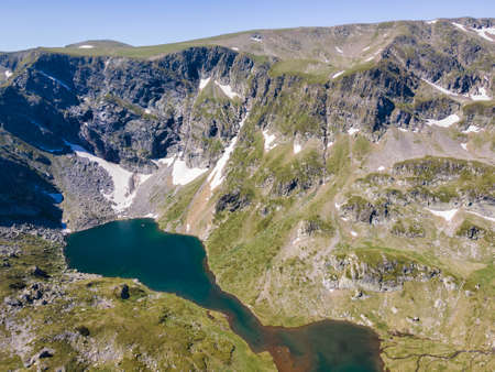 Aerial view of Elenino lake near Malyovitsa peak, Rila Mountain, Bulgaria