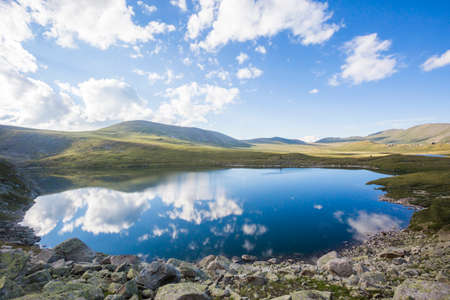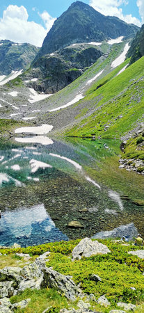 Landscape of Retezat National Park mountains in South Carpatians, Transylvania, Romania, Europe. Small lake with blue sky reflection at center.