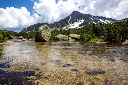 Clouds over Banderishki chukar peak and mountain river, Pirin Mountain, Bulgaria