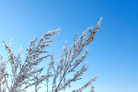 A branch covered in frost and snow. The branch is surrounded by a blue sky. Concept of calmness and serenity