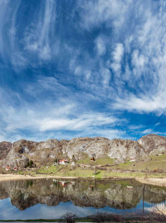A reflection of the rocky shore and the blue sky with clouds in the lake. Vertical panorama. Balkans