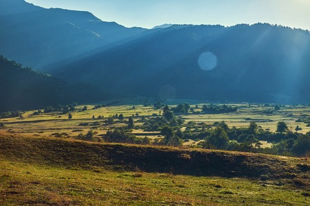 Morning landscape with blue mountains and green valley with lense flare