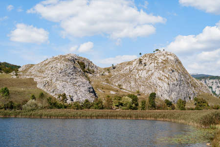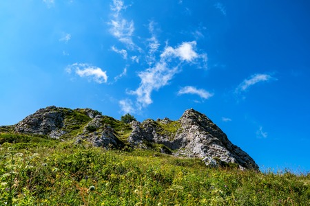 Summer image with rocks,grass and blue sky in Trascau Mountains,Transylvania,Romania.