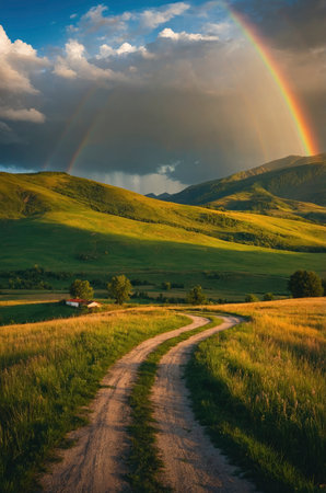 A vibrant rainbow arches across a cloudy sky above picturesque green hills, with a winding road leading to a small building. This stunning landscape photograph is ideal for travel and environmental projects.