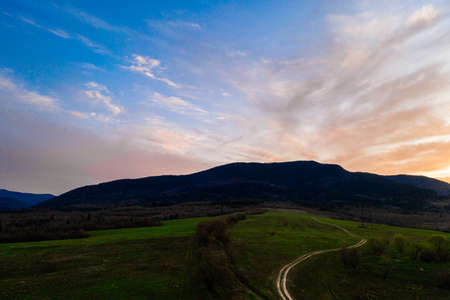 Aerial view of endless lush pastures and farmlands of Transylvania. Beautiful romanian countryside with emerald green fields and meadows. Rural landscape on sunset.