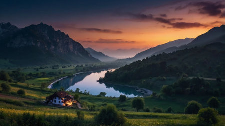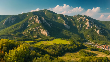 Dramatic Mountain Peaks Over Lush Green Valley Landscape at Golden Hour