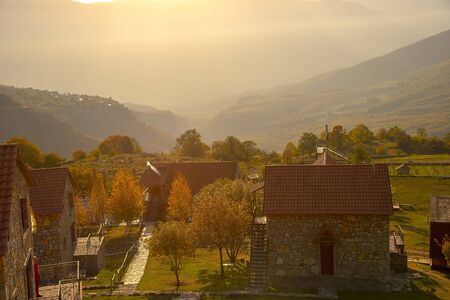 Sunrise over the mountains and the village.Autumn landscape.In a light misty haze.