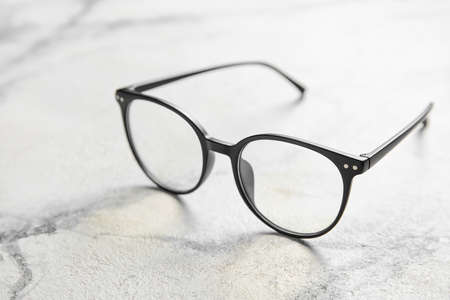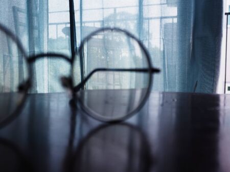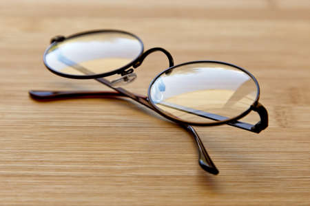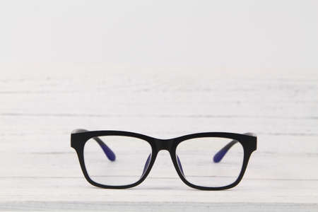 eyeglasses on the table in front of the light background.