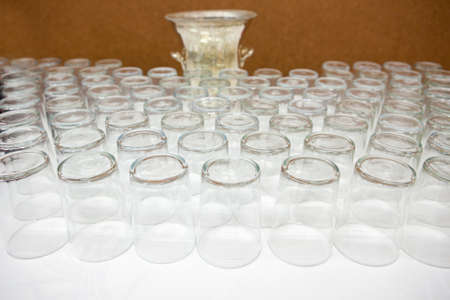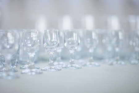 Many empty glasses in buffet restaurant, small glass water, glass background.