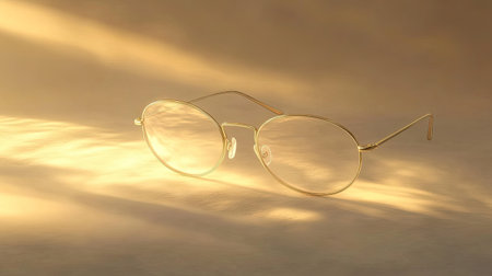 A pair of elegant gold rimmed glasses resting on a soft golden background, showcasing gentle light reflections that create an artistic atmosphere.