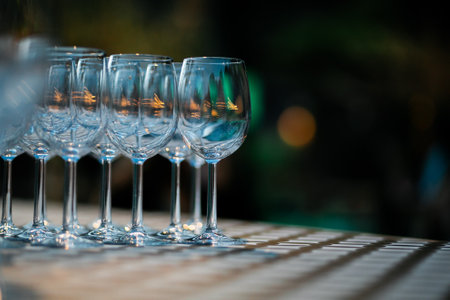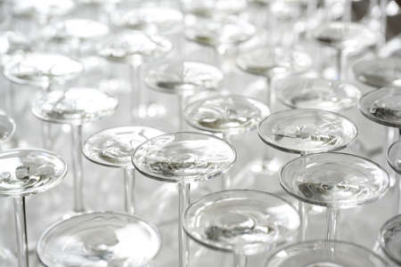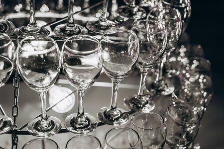 Clean glasses on a table prepared by the bartender for champagne and wine. Several of transparent glasses on a rack. Catering for the event preparation, clean glasses for drinks. Soft focus.