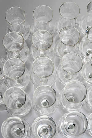 Some rows of empty wine glasses over white background. closeup