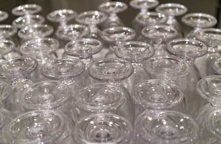 Many wine glasses set upside down for a food and drink event, full frame background, copy space, selected focus, narrow depth of field