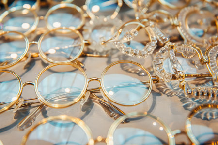 A table covered with numerous gold glasses arranged neatly in rows and clusters, A collection of vintage-inspired round frames with gold accents