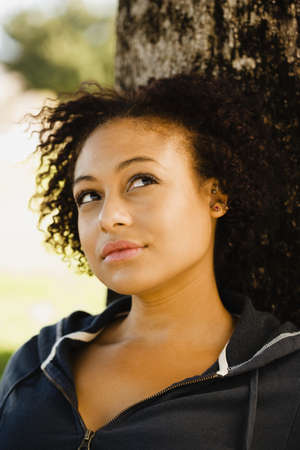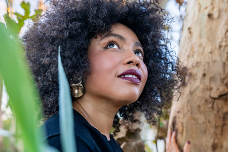 beautiful african american woman portrait with glasses smiling touching her curly hair outdoors in public park sunny day