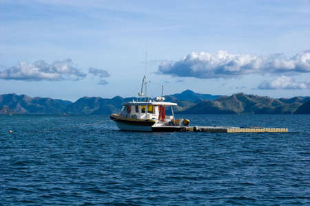 Tourist boat from the panorama view of Flores in an evening, Flores Island (Komodo National Park), Flores, Indonesia