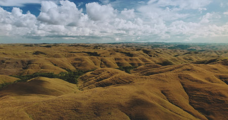 Aerial drone revealing the stunning Wairinding Hill landscape on Sumba Island, Indonesia, with golden rolling hills under a vibrant sky and fluffy white clouds